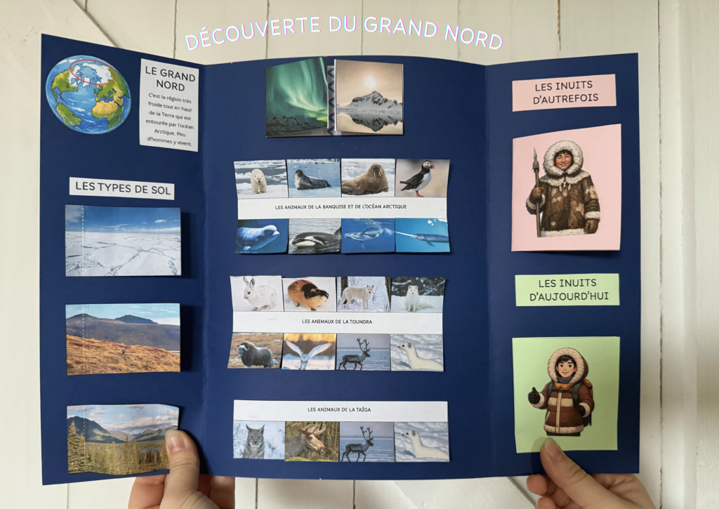 Dans notre Lapbook, nous avons intégré une carte du monde, une présentation du Grand Nord et des trois types de sol, les animaux par zone, une partie sur la vie des inuits et une partie sur les saisons.